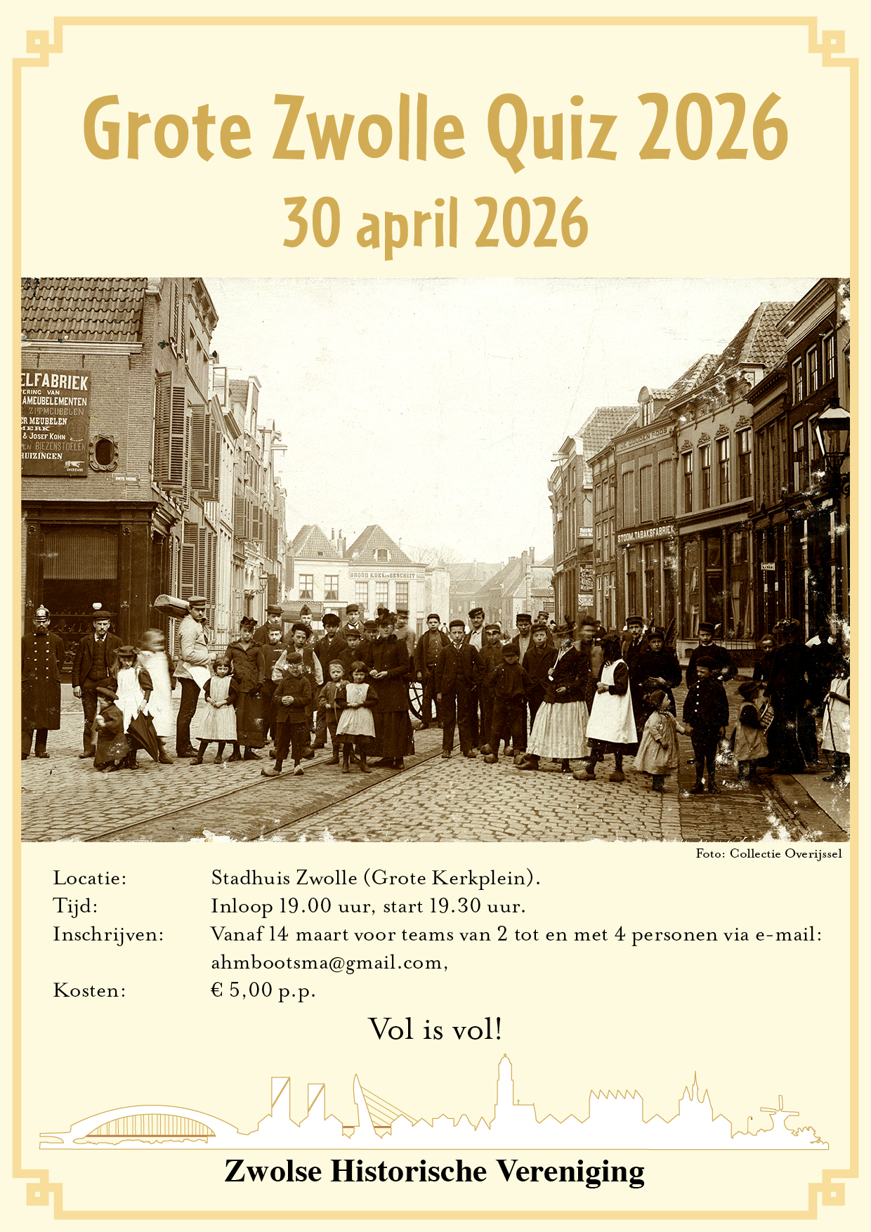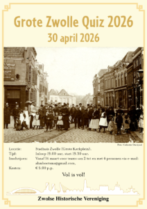 Op 30 april 2026 is het weer zover: de Zwolle-quiz ! Deze wordt voor de 6e keer in successie georganiseerd door de Zwolse Historische Vereniging, met als locatie de Panoramazaal in het stadhuis aan het Grote Kerkplein.